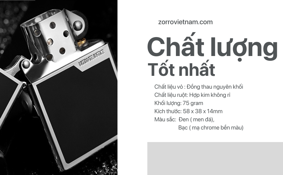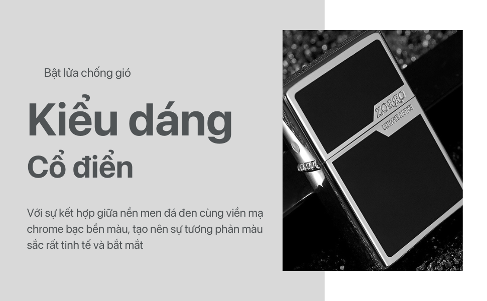 Với thiết kế độc đáo, kết hợp giữa nét cổ điển và hiện đại, bật lửa Zorro hay hộp quẹt Zorro đã nhanh chóng trở thành phụ kiện thời trang được giới trẻ yêu thích. Chất liệu đồng nguyên khối cao cấp, cùng với những họa tiết hoa văn tinh xảo, tạo nên vẻ đẹp sang trọng và bền bỉ theo thời gian.