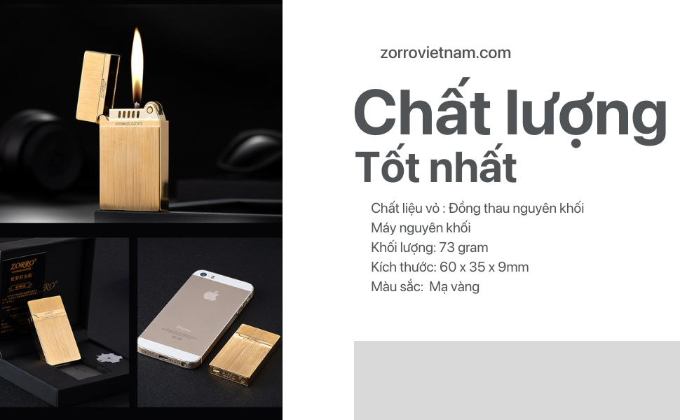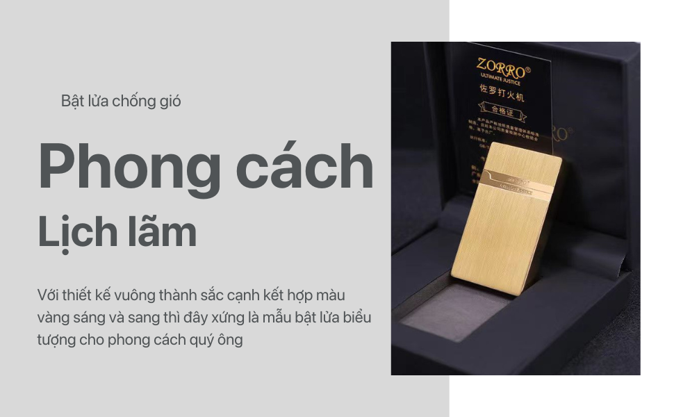 Với thiết kế độc đáo, kết hợp giữa nét cổ điển và hiện đại, bật lửa Zorro hay hộp quẹt Zorro đã nhanh chóng trở thành phụ kiện thời trang được giới trẻ yêu thích. Chất liệu đồng nguyên khối cao cấp, cùng với những họa tiết hoa văn tinh xảo, tạo nên vẻ đẹp sang trọng và bền bỉ theo thời gian.
